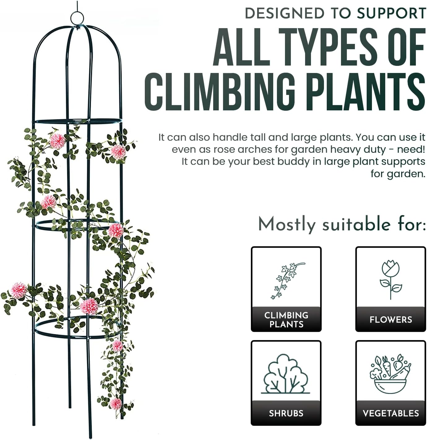 Made for the Outdoors - Crafted from high-quality steel with a durable metal finish, our garden obelisks are built to withstand the elements. Whether rain or shine, they resist rust and maintain their strength, providing year-round support for tall and large plants. Ideal as heavy-duty rose arches or sturdy garden plant supports, they are designed for lasting durability and performance.